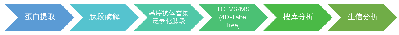 發(fā)生泛素化修飾的賴氨酸共價連接泛素分子,即兩個甘氨酸K-ε-GG殘基,會使靶向蛋白分子量產(chǎn)生質(zhì)量偏移。利用質(zhì)譜可準確測定分子量是否發(fā)生質(zhì)量偏移,從而檢測泛素化修飾肽段及位點。4D-label free泛素化修飾組學是基于timsTOF Pro質(zhì)譜儀,通過數(shù)據(jù)依賴性采集-同步累積連續(xù)碎裂(ddaPASEF)掃描模式進行差異泛素化蛋白質(zhì)組學分析。與普通修飾蛋白組相比,增加了離子淌度的維度,同時能根據(jù)分子的形狀、截面積屬性有效區(qū)分修飾同分異構多肽,極大提高修飾的鑒定深度。
